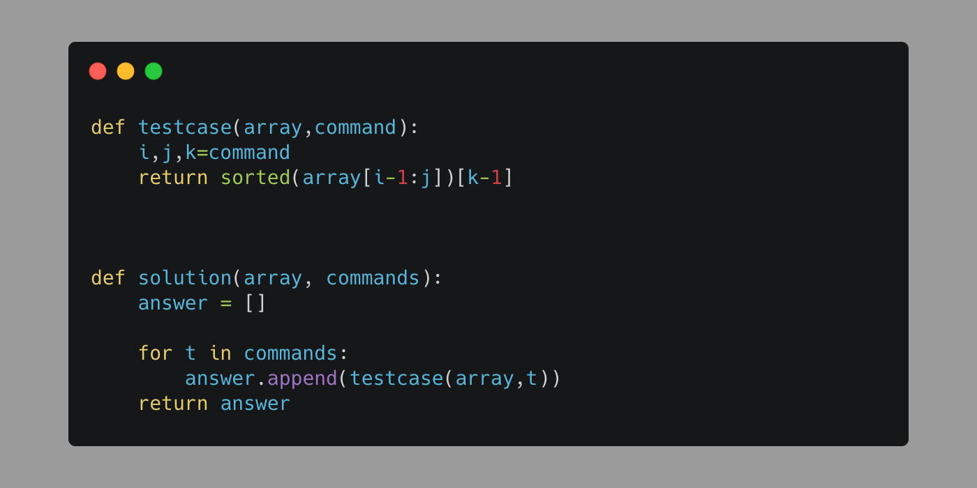 배열 array, [i, j, k]를 원소로 가진 2차원 배열 commands가 매개변수로 주어질 때, commands의 모든 원소에 대해 앞서 설명한 연산을 적용했을 때 나온 결과를 배열에 담아 return 하도록 solution 함수를 작성해주세요.