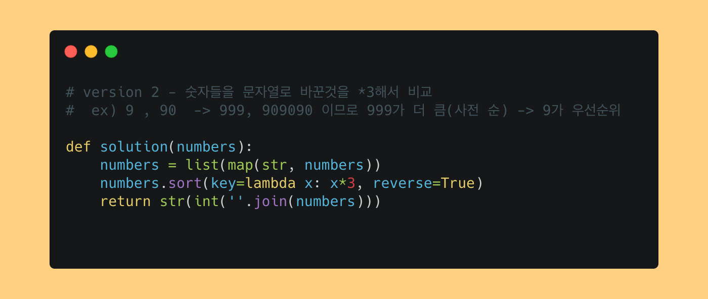 -> 숫자들이 1000이하 이므로 문자열 변환 후 3번 반복해서 더해주면 쉽게 사전순으로 비교가 가능하다! ㄷㄷ