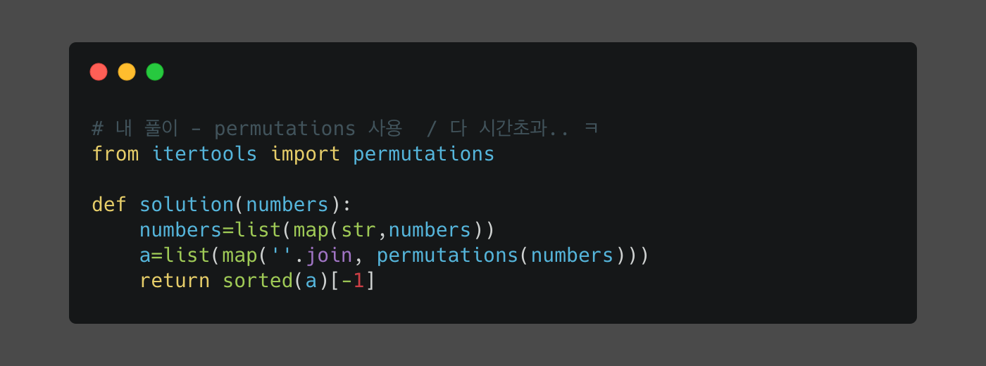 0 또는 양의 정수가 담긴 배열 numbers가 매개변수로 주어질 때, 순서를 재배치하여 만들 수 있는 가장 큰 수를 문자열로 바꾸어 return 하도록 solution 함수를 작성해주세요.