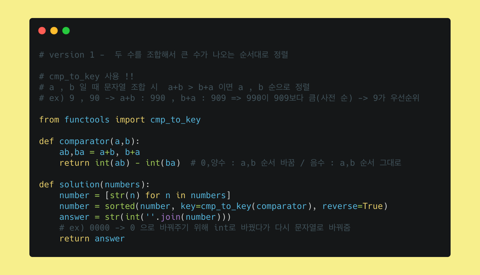 -> a,b 두 수를 조합해서 만들어진 문자열이 사전순으로 a+b가 더 크다면 a,b 순으로 / 반대라면 b,a 순으로 정렬하는 것.