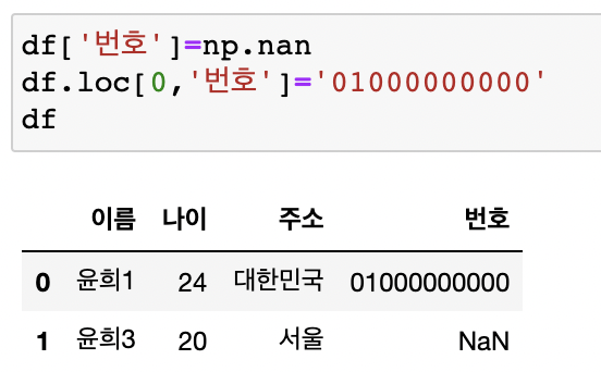 NaN값으로 초기화 한 새로운 컬럼 추가