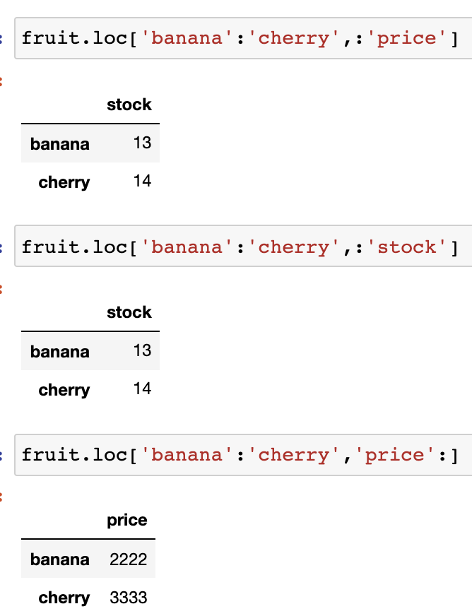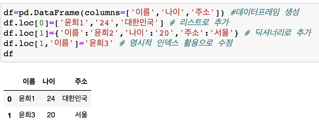 .loc : 명시적인 인덱스를 참조하는 인덱싱/슬라이싱 (a:b 이면 b 도 포함함!)