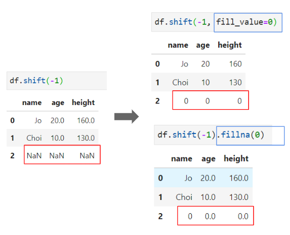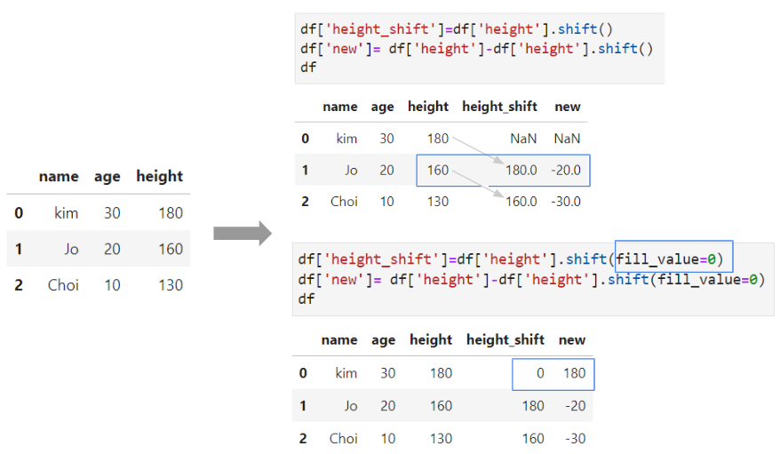 shift()를 사용하면 행이 밀리면서 NaN의 값들을 가지는 행이 발생하는 것을 볼 수 있는데,