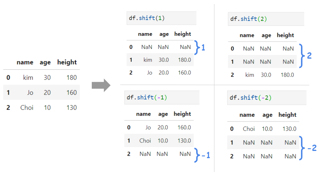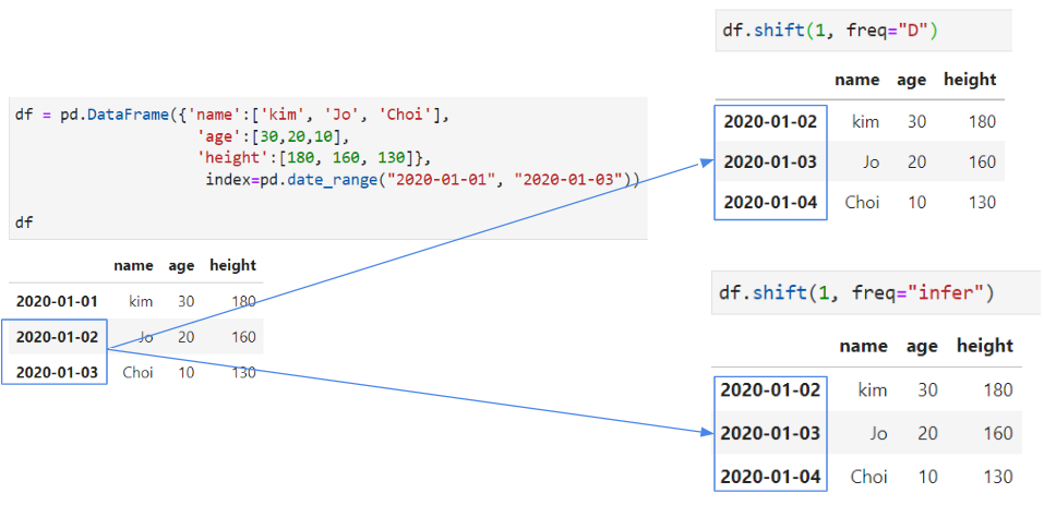 df.shift(n)을 사용했을 때, n의 수만큼 행이 아래로 내려가는 것을 확인할 수 있다.
