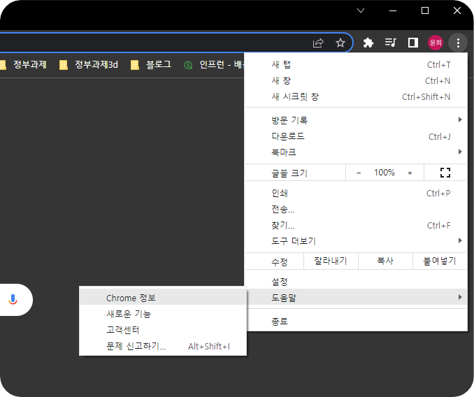 크롬 실행 -> 오른쪽 위 점 3개 클릭 -> 도움말 -> Chrome 정보 클릭