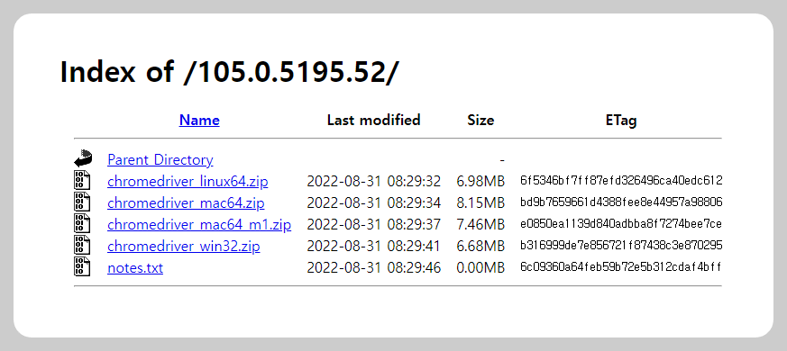 나의 크롬 버전은 105.xx 였으므로, 두번째 줄의 ChromeDriver 105.0.5195.52 를 클릭