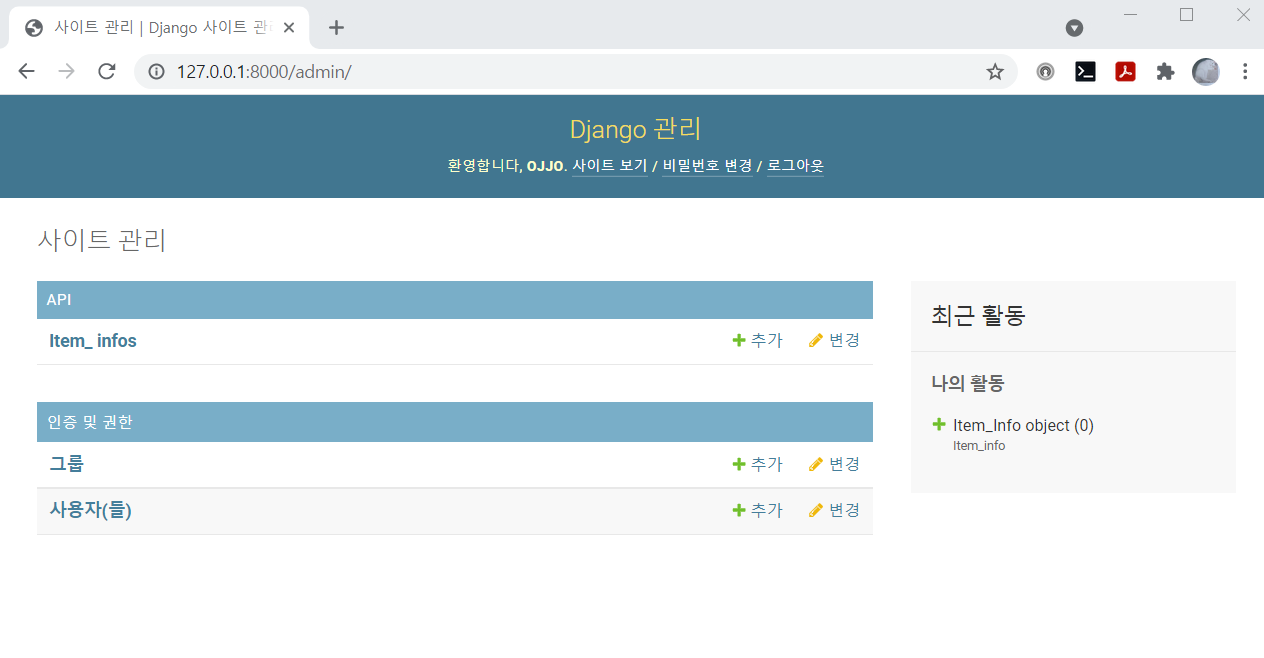 우측의 추가, 변경 버튼을 통해 admin 페이지에서도 db를 수정가능하다 ~~!!